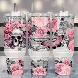 Pastel Pink Skull 30oz or 40oz Tumbler Butterfly Tumbler Quencher Tumbler Gift For Her Him Birthday Gift LN Floral Tumbler With Handle