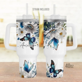 30oz or 40oz Tumbler with Handle, Butterfly And Daisy Personalized, Custom Floral Blue Butterfly Gift for Her HG