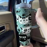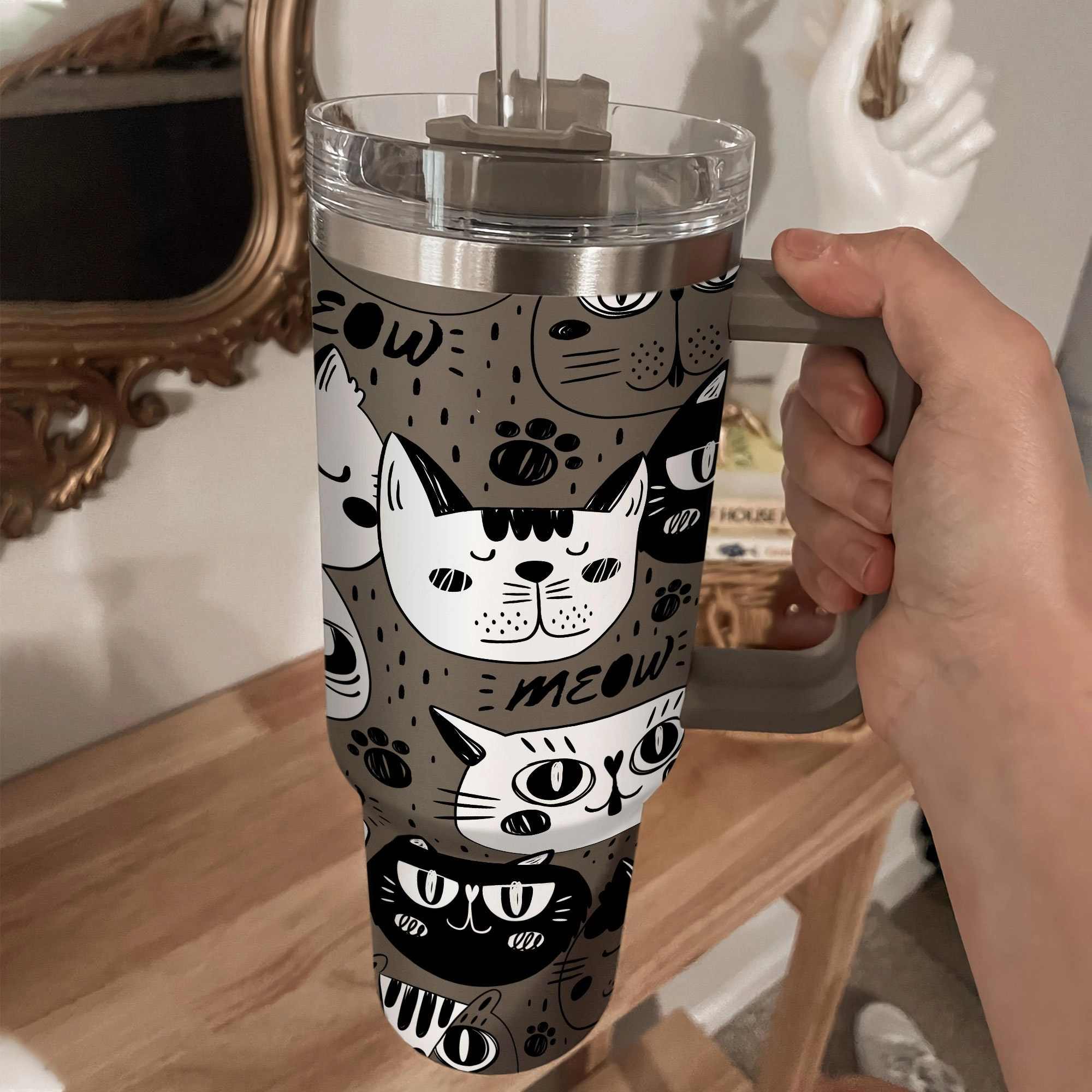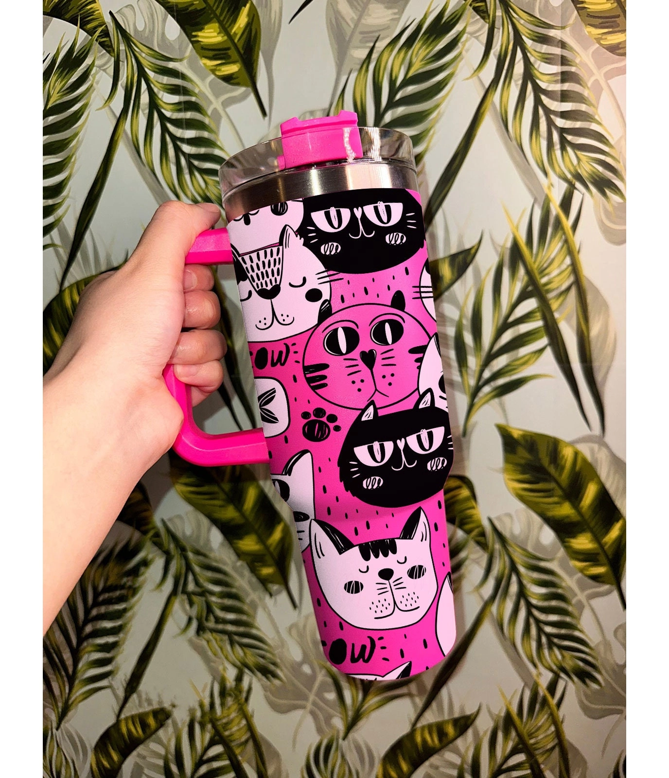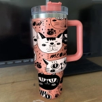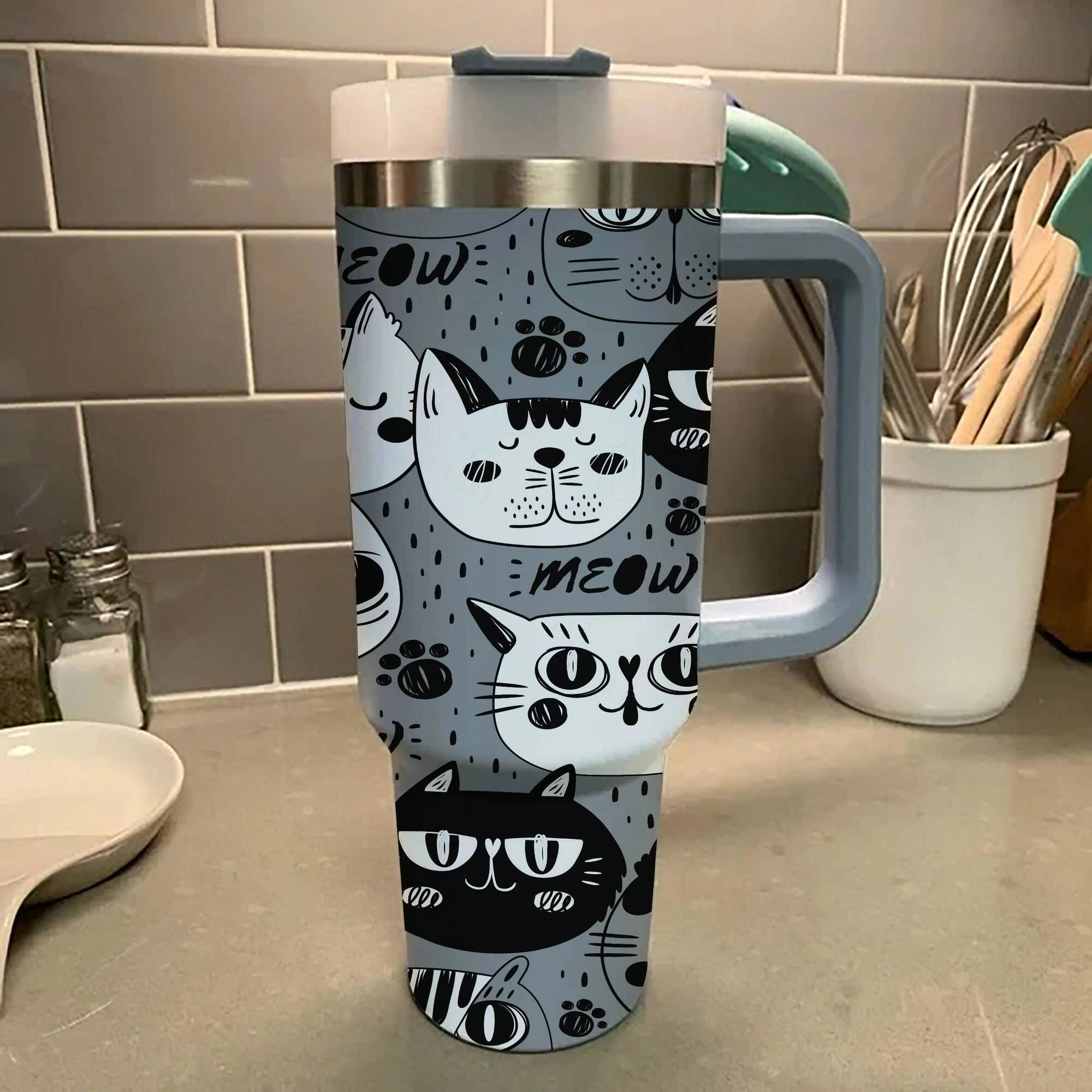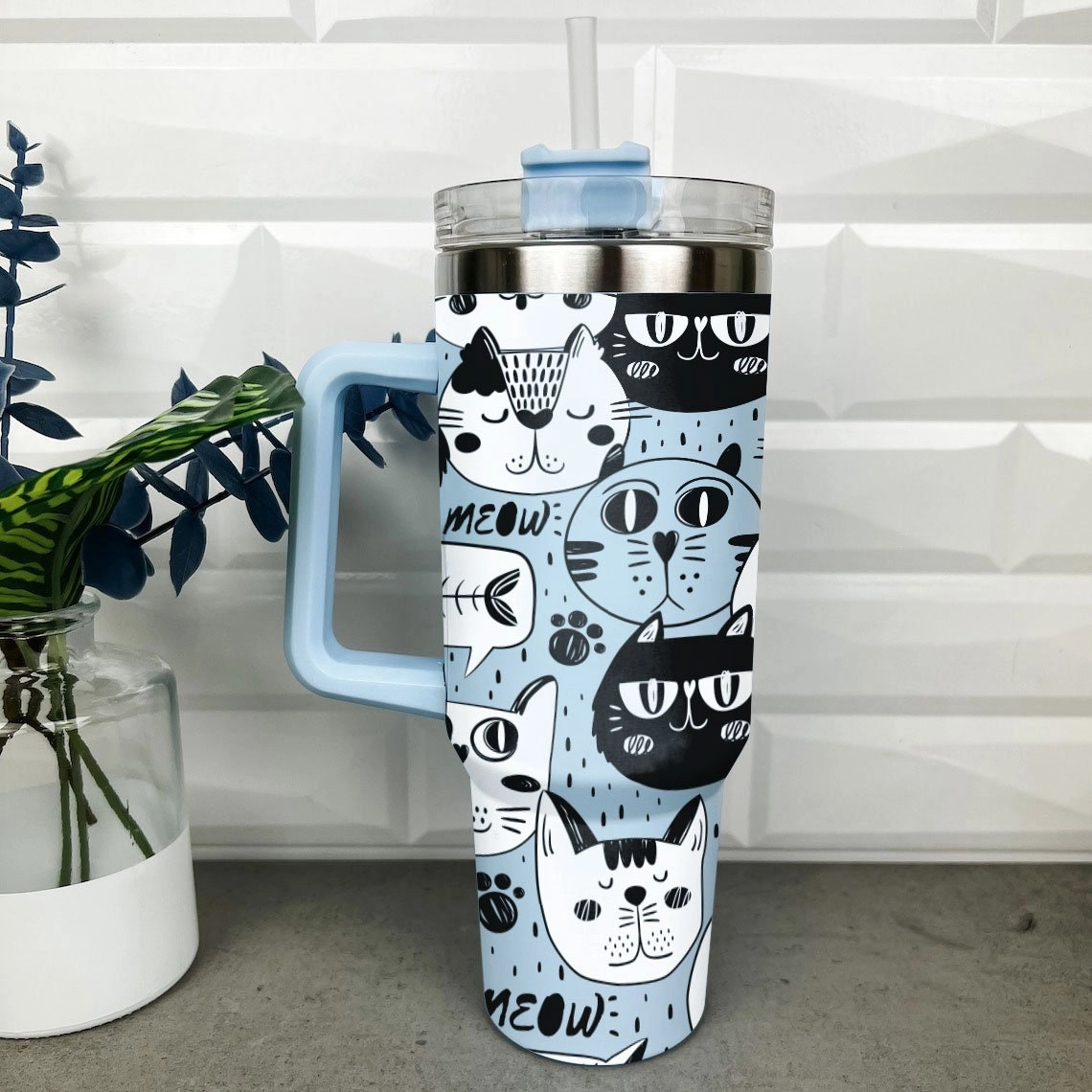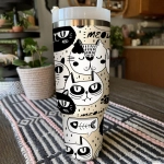 Meow Cat Tumbler 30oz or 40oz With Handle, Cat Pattern 40oz Tumbler, Cat Mom, Cat Lover Tumbler 30oz or 40oz, Stainless Steel Tumbler, Insulated Tumbler HFN