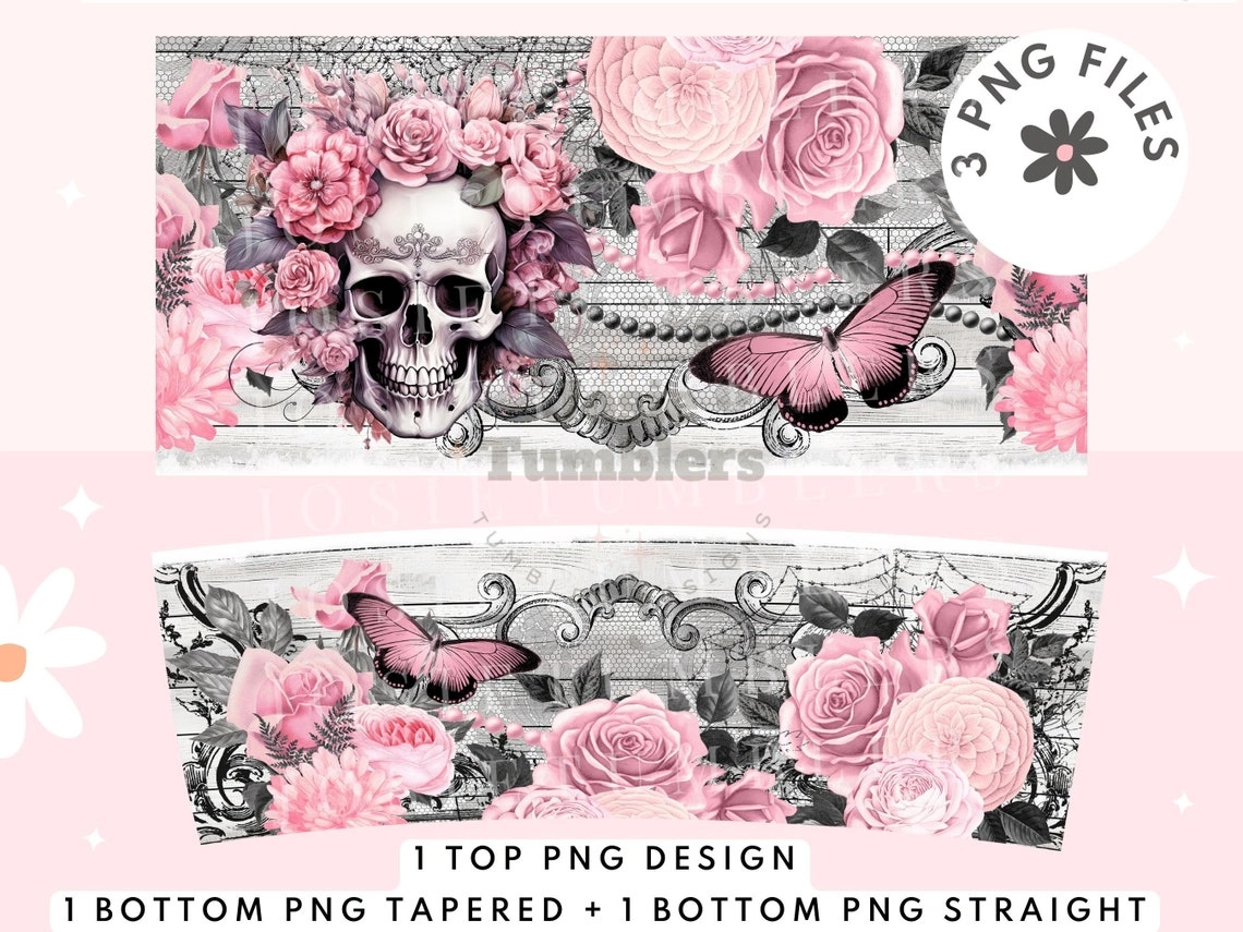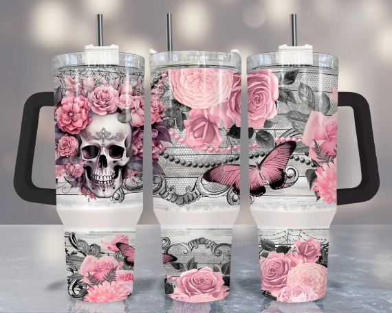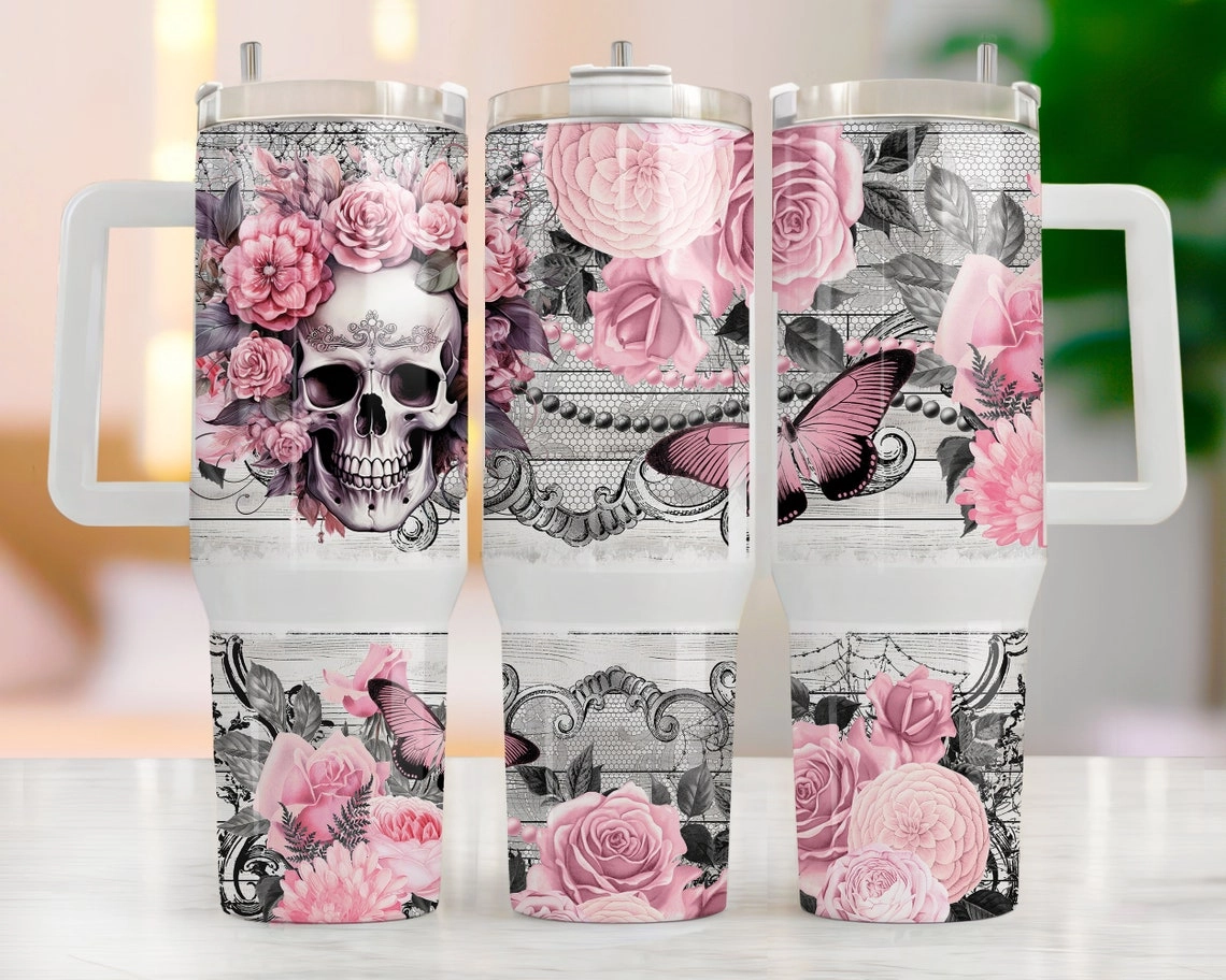 Pastel Pink Skull 30oz or 40oz Tumbler Butterfly Tumbler Quencher Tumbler Gift For Her Him Birthday Gift LN Floral Tumbler With Handle
